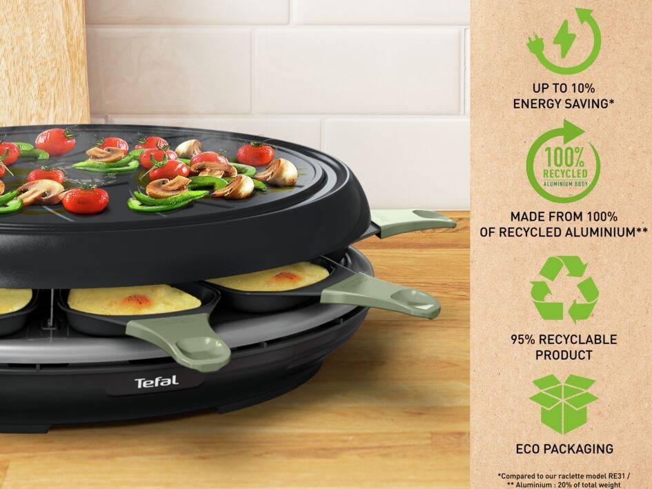 LIMITEZ VOTRE IMPACT SUR L'ENVIRONNEMENT : Eco conçu, respectueux de l'environnement pour un impact réduit et des résultats toujours délicieux RACLETTE POUR 8 PERSONNES : idéal pour partager de délicieux moments en famille et entre amis FONCTION 2-EN-1 : profitez d'une grande variété de repas grâce à la fonction raclette et la plaque gril légumes. REVÊTEMENT ANTIADHÉSIF : la plaque et les poêlons pour une meilleure durabilité, résistance et un nettoyage faclile. Réparabilité 15 ans, Garantie 2 ans, Fabriqué en France ECO CONCU : 10% d'économie d'énergie ((comparé à notre raclette modèle RE310412 (consommation d'énergie en W)) un produit recyclable à 95 % (recyclabilité potentielle, à trier dans les installations appropriées), avec un emballage recyclable, sans plastique, composé à 90 % de fibres recyclées COMPATIBLE LAVE-VAISSELLE : idéal pour une utilisation fréquente