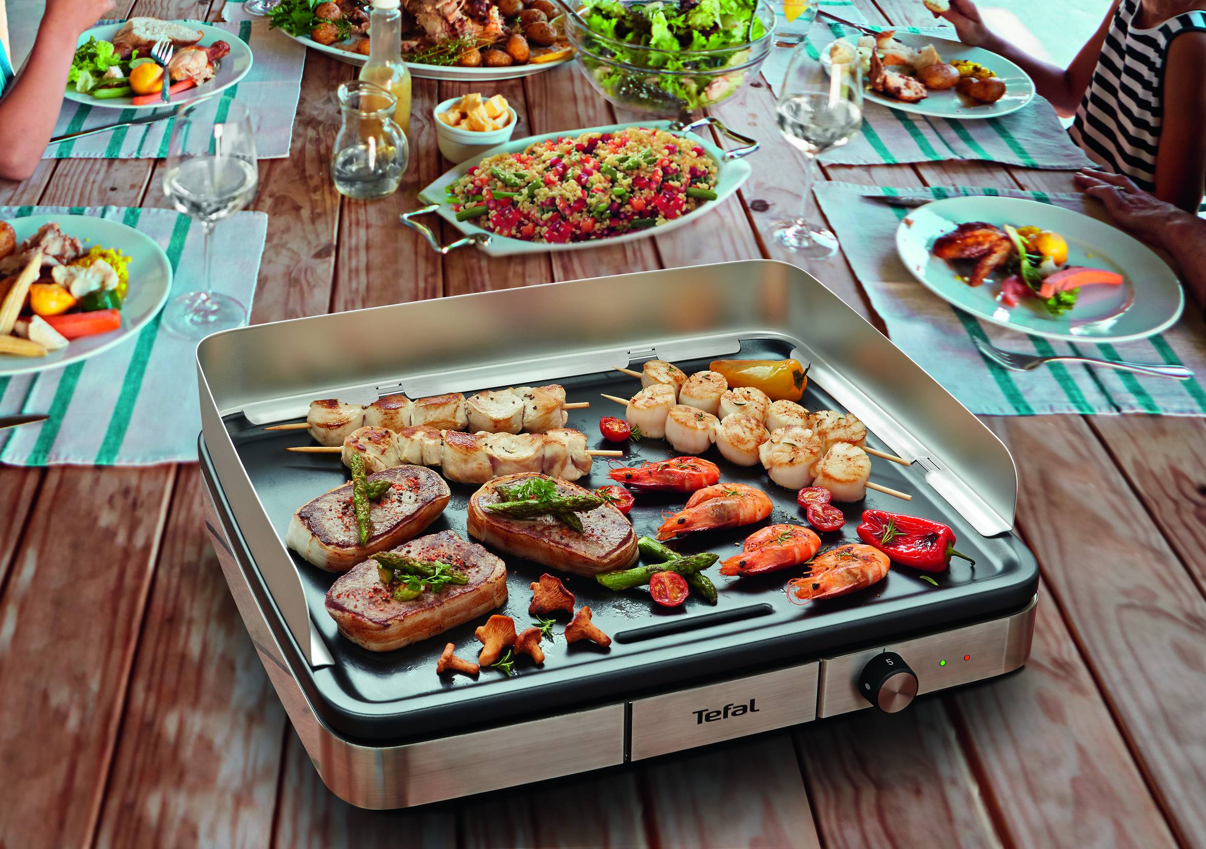 Avec sa très grande capacité permettant de servir jusqu'à 10 personnes et des performances de cuisson impressionnantes, la Maxi Plancha XXL de Tefal a été conçue pour préparer des repas inoubliables tout au long de l'année. Sa puissance élevée garantit des plats cuits à la perfection, à la fois tendres et succulents, avec des fonctions conçues pour une utilisation en intérieur et en extérieur, dont un pare-vent pour profiter de délicieux repas à la plancha n'importe où et n'importe quand. Le revêtement antiadhésif ne nécessite aucun ajout de matière grasse, pour une cuisson plus saine et des saveurs exceptionnelles, ainsi qu'un nettoyage facile et des performances durables. Les cinq réglages de cuisson vous offrent une infinité de possibilités pour faire griller tous vos ingrédients favoris, de la viande au poisson, sans oublier les légumes, etc. Libérez votre créativité et savourez de délicieux repas faits maison avec vos amis et votre famille tout au long de l'année.