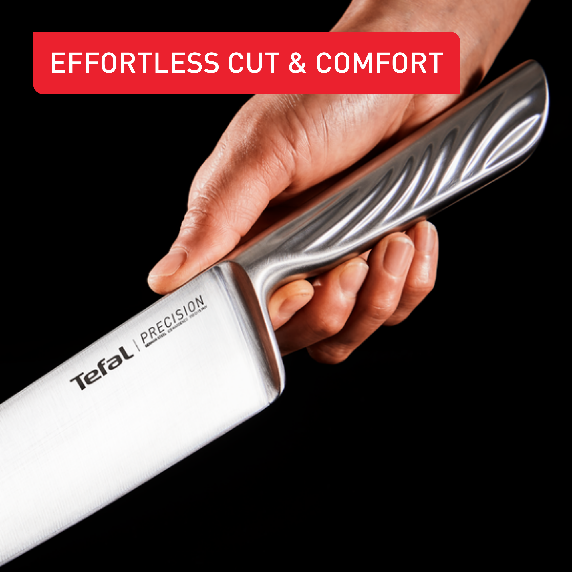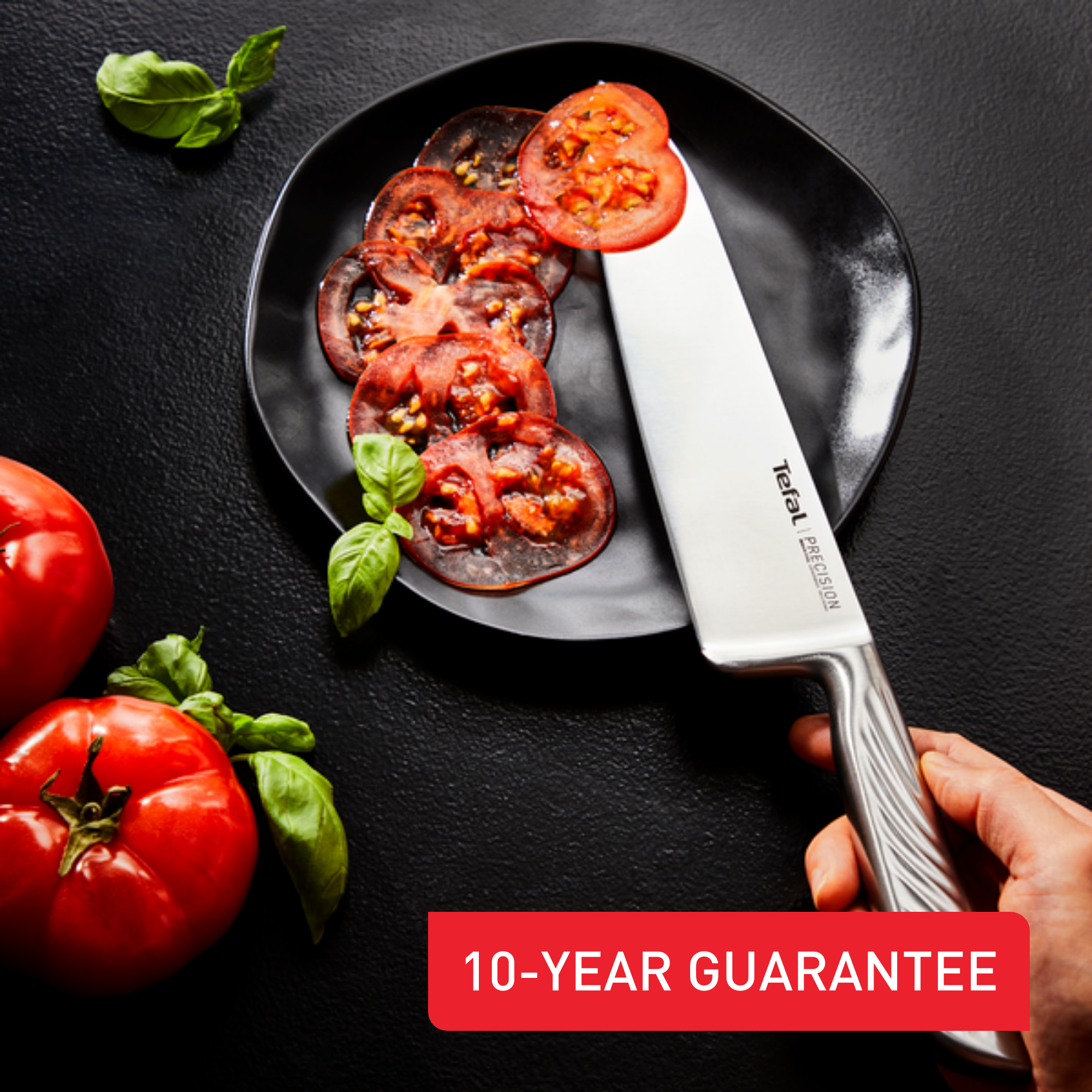 Découvrez Precision, la collection de couteaux la plus tranchante de Tefal, et profitez d'une coupe parfaite et précise à chaque utilisation. C'est le couteau de cuisine qui transforme chaque ingrédient en un jeu d'enfant—le tout avec une élégance parfaite ! Appréciez des lignes sophistiquées et un confort incomparable en main. Entièrement fabriqué en acier inoxydable allemand et traité par notre procédé spécial de trempe à froid (Ice Hardening), Precision offre des performances durables, une solidité exceptionnelle et une résistance à la corrosion.