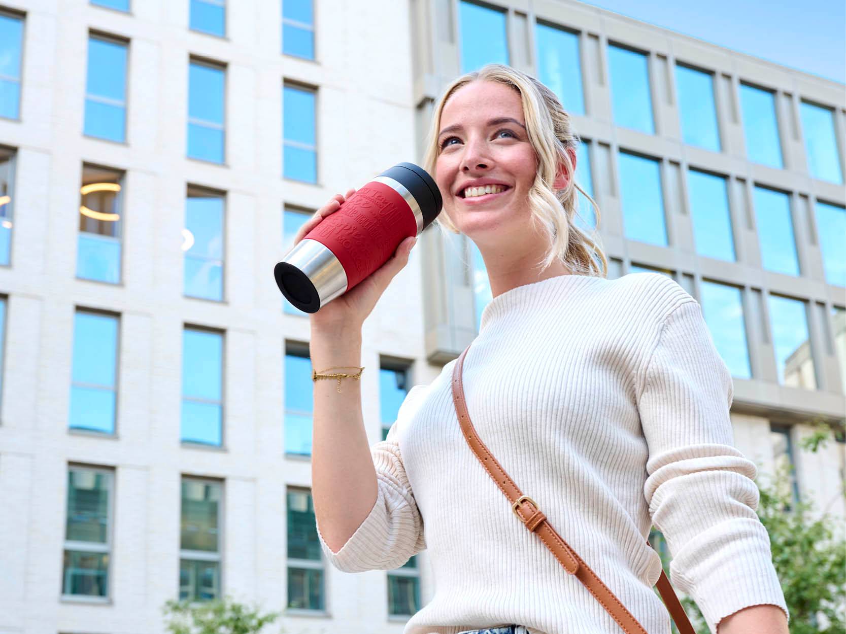 Avec son couvercle à visser qui facilite le remplissage, découvrez le mug de voyage parfait à utiliser au quotidien, pour emporter toutes vos boissons préférées avec vous. Vos boissons à portée de main : Le couvercle Quick Press doté d'une soupape de pression est facile à ouvrir, pour une gorgée rapide dès que vous en avez besoin. Fabriqué en acier inoxydable résistant et durable, notre mug de voyage est conçu pour durer, dans le cadre de notre engagement à réduire les déchets.