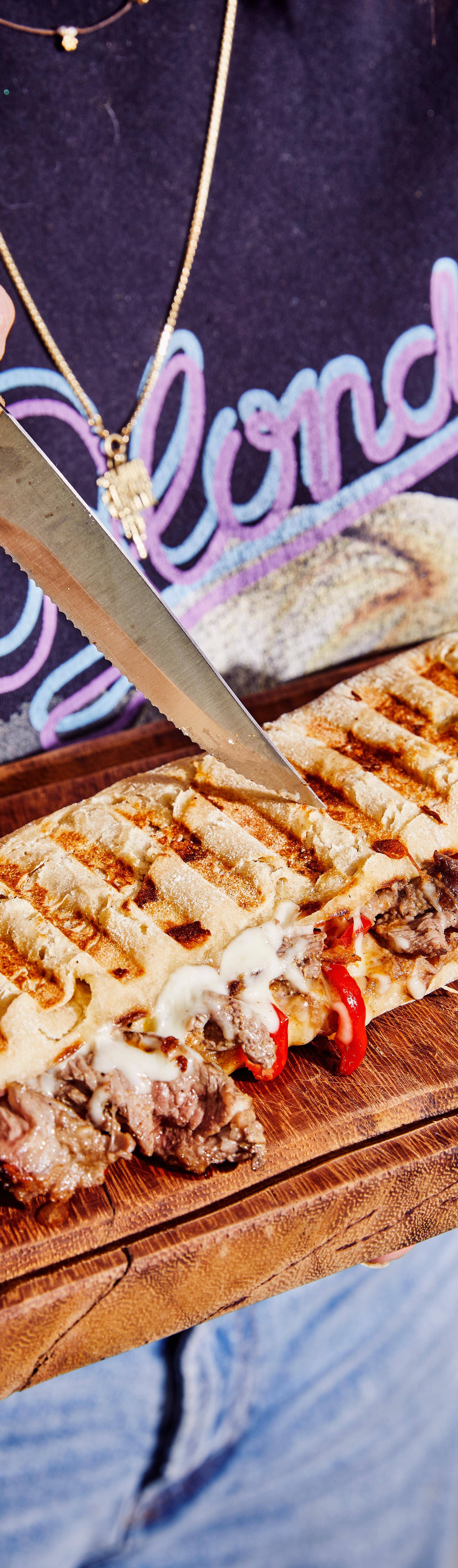 Coupez la viande en fines lamelles, déposez-les sur les pains, ajoutez l’autre moitié du fromage et refermez avec la partie supérieure du panini.