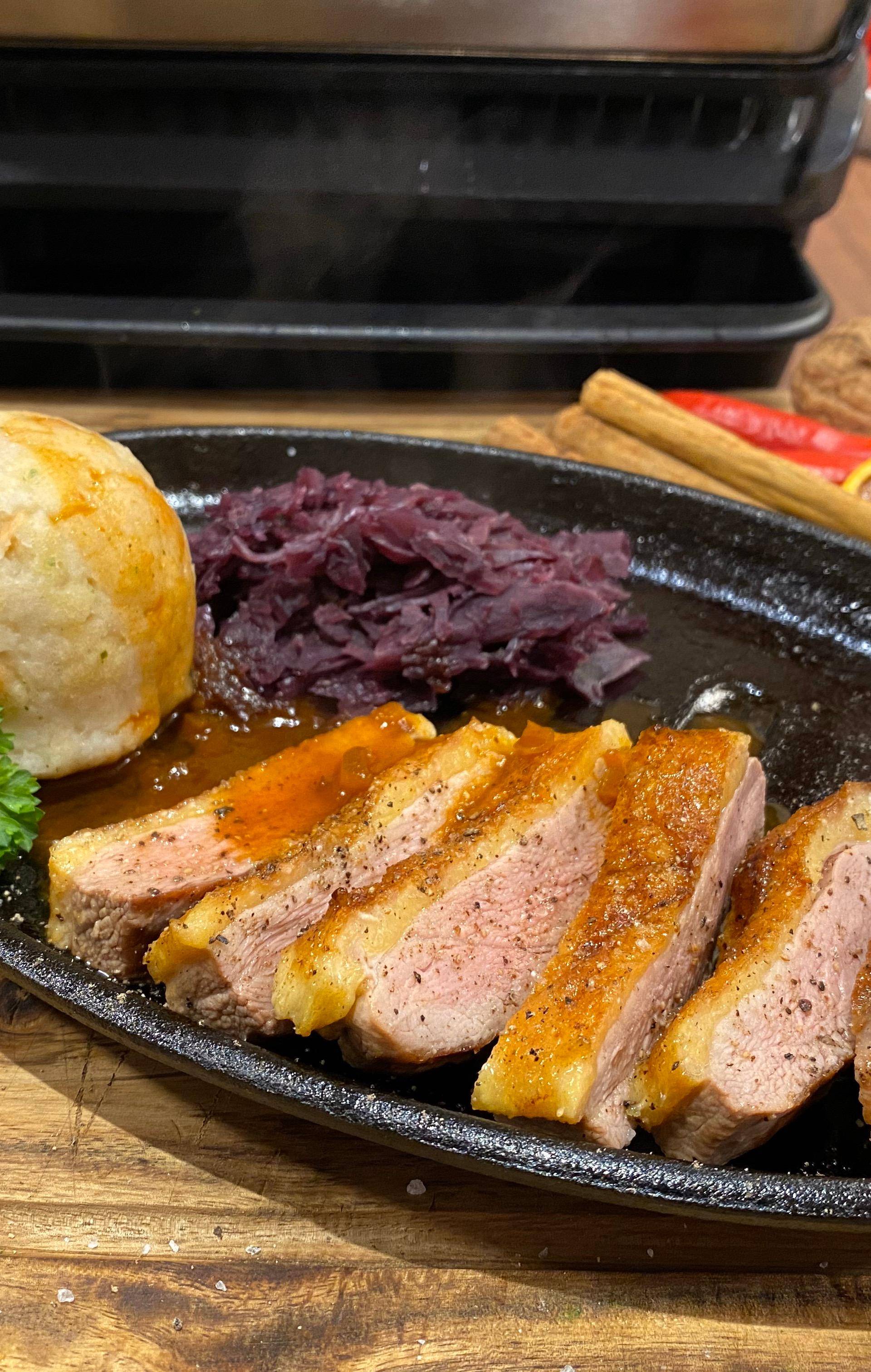 Retirez les magrets de canard de l’accessoire four et laissez-les reposer 5 min. avant de les trancher. Servez avec les pommes et le jus.