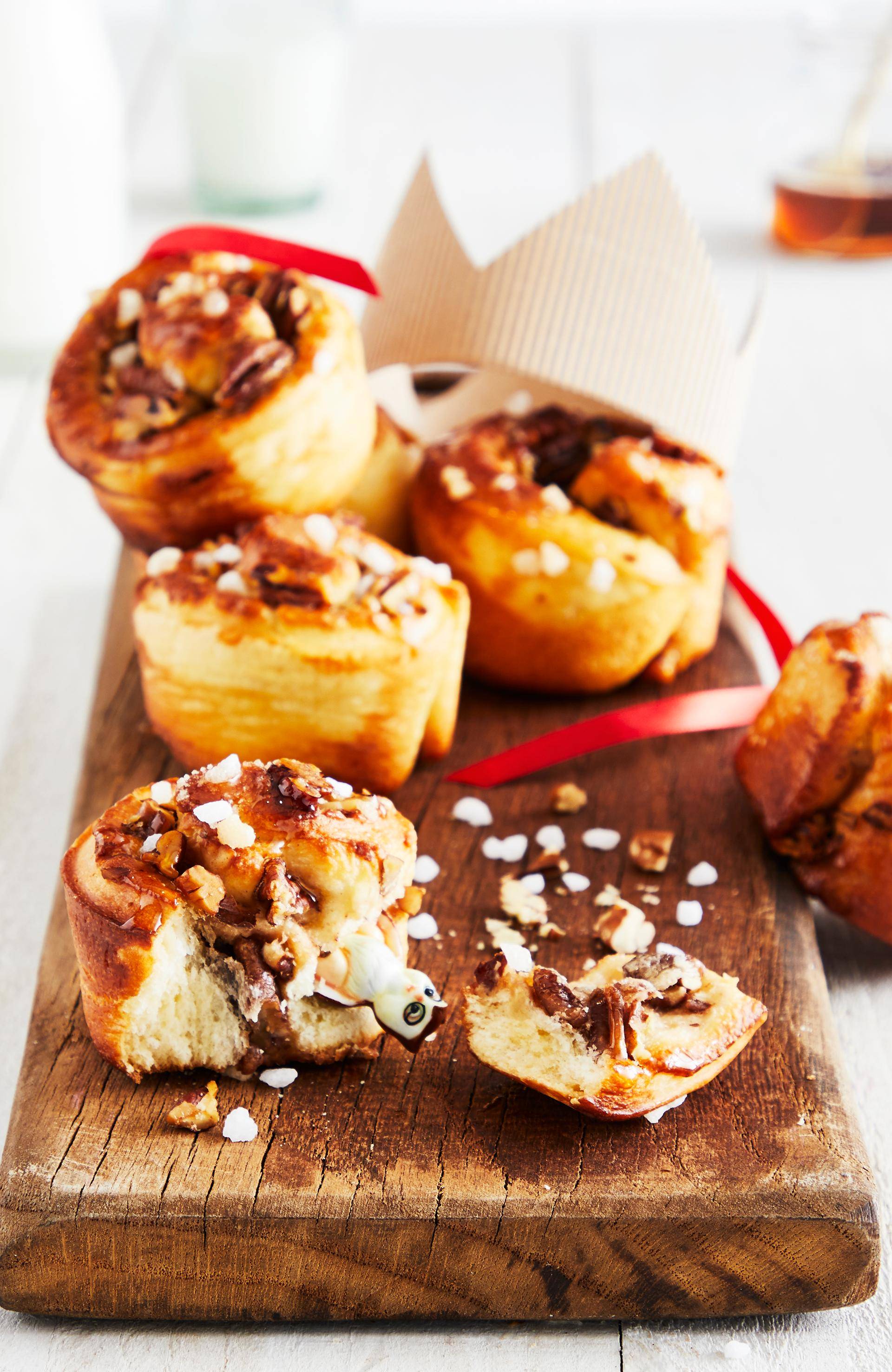 Concasser les noix de pécan. Puis, à l’aide d’un pinceau, étaler du sirop d'érable sur la bande de pâte à brioche et répartir les noix de pécan. Rouler la pâte dans le sens de la largeur de sorte à reformer le boudin de pâte. A l’aide d’un couteau, couper la pâte en 6 tronçons de même taille.