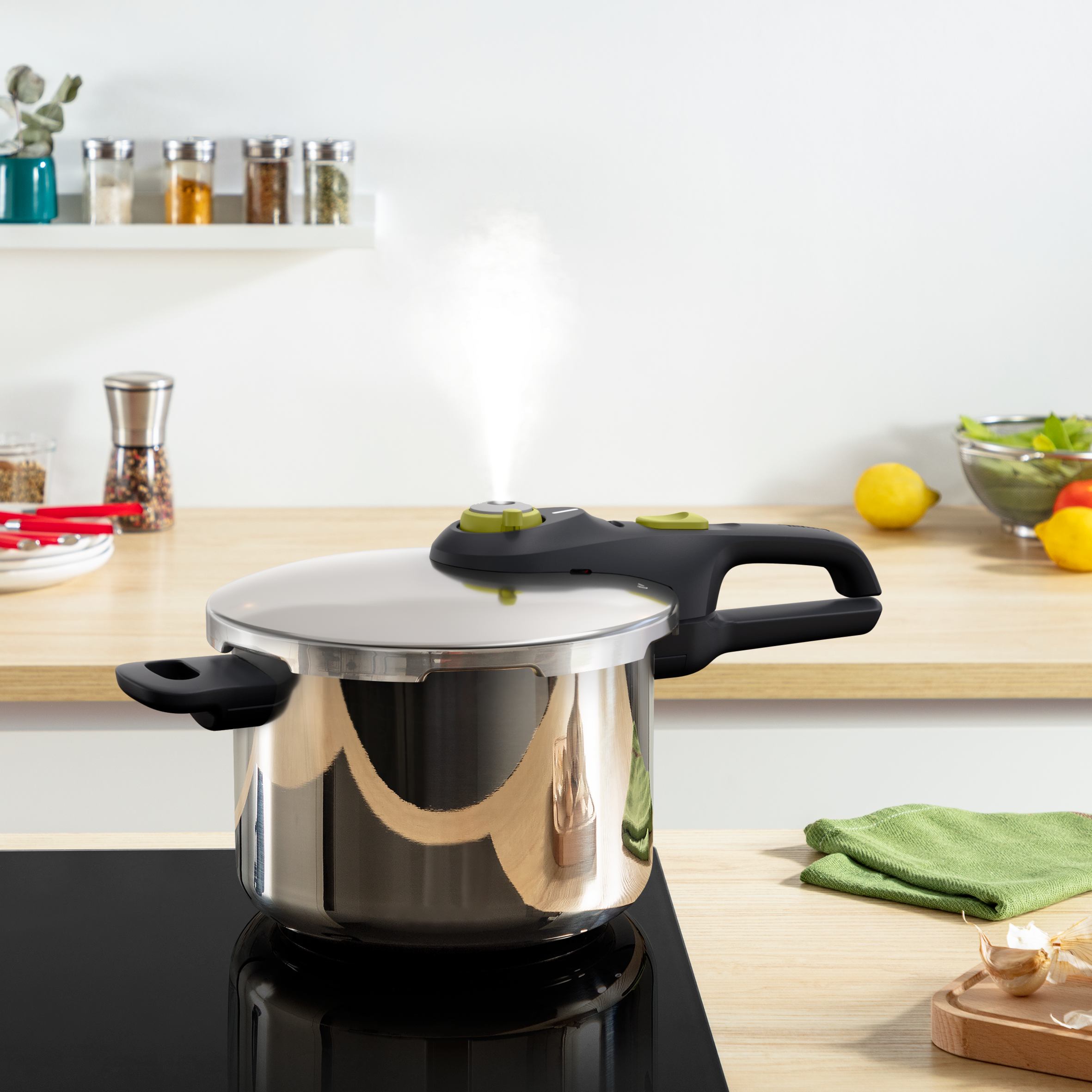 Superveilige snelkookpan voor tweemaal zo snelle bereiding van al je je favoriete (stoof)gerechten zoals hachee, stoofvlees of het stomen van verse groenten. Ideaal voor maaltijden met ene lange bereidingstijd! Bespaar tot 50% energie* én kook gezond doordat de vitamines en mineralen niet verloren gaan Exclusief veiligheidssysteem: automatisch openen en sluiten, drukventiel, veiligheidsventiel, afdichtingsring en gereguleerd ontsnappen van overmatige stoom. Geschikt voor alle warmtebronnen (gas, elektrisch, halogeen, keramisch), incl. inductie De sterke sandwichbodem (rvs-aluminium-rvs) zorgt voor een snelle opwarming en uitstekende warmteverdeling door de hele pan. Met 2 kookprogramma's voor groenten en vis/vlees, inclusief handige maatverdeling aan de binnenzijde Vaatwasmachinebestendig ontwerp (deksel niet geschikt voor vaatwasser) Gemaakt van zeer hoge kwaliteit roestvrij staal waarop Tefal maar liefst 10 jaar garantie geeft