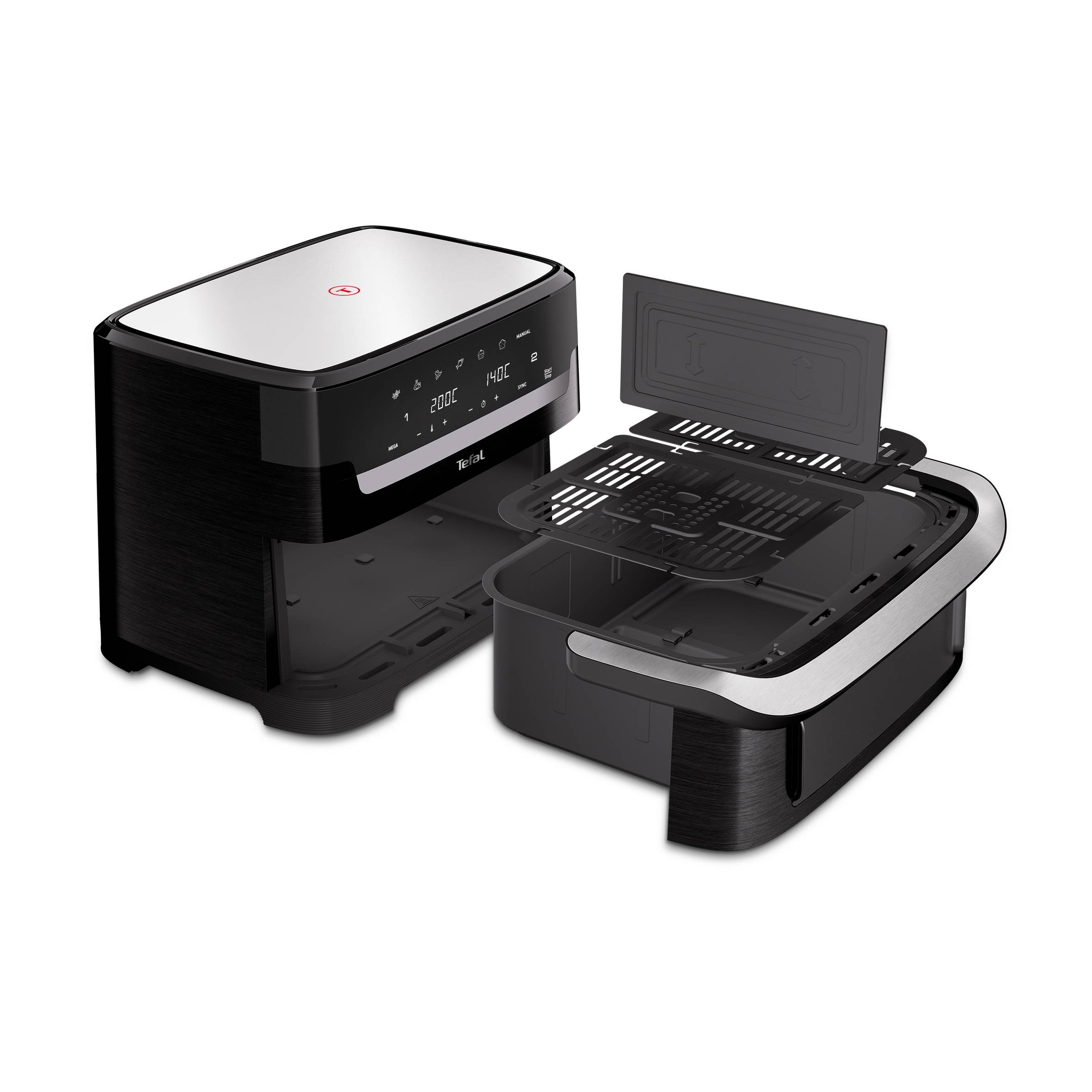 Wissel eenvoudig van 2 zones (5,5 liter + 3,5 liter) naar 1 extra grote kookzone (9 liter), dankzij het FlexCook-tussenschot - voor eindeloze mogelijkheden GiantZone van 9 liter voor grote familiemaaltijden zoals lasagne - voor maximaal 8 personen Dual zones om 2 gerechten tegelijk te bereiden, met 2 volledig onafhankelijke verwarmingselementen, met individuele tijd- en temperatuurregeling. Gebruik de Sync-Functie zodat de gerechten tegelijk klaar zijn. Uitneembaar FlexCook-tussenschot om van twee zones één grote kookzone te maken 7 vooraf ingestelde programma's - friet, kip, groenten, vis, bakrecepten, nagerechten en een handmatige stand Verbruik tot 70% minder energie met Tefal air fryers (*test uitgevoerd in 2024 op diepvriesfrietjes) Gratis My Tefal-app met meer dan 100 stap-voor-stap geïllustreerde recepten en geavanceerde tips, voor eindeloze inspiratie 15 jaar lang repareerbaarheid om de planeet te beschermen en afval te verminderen