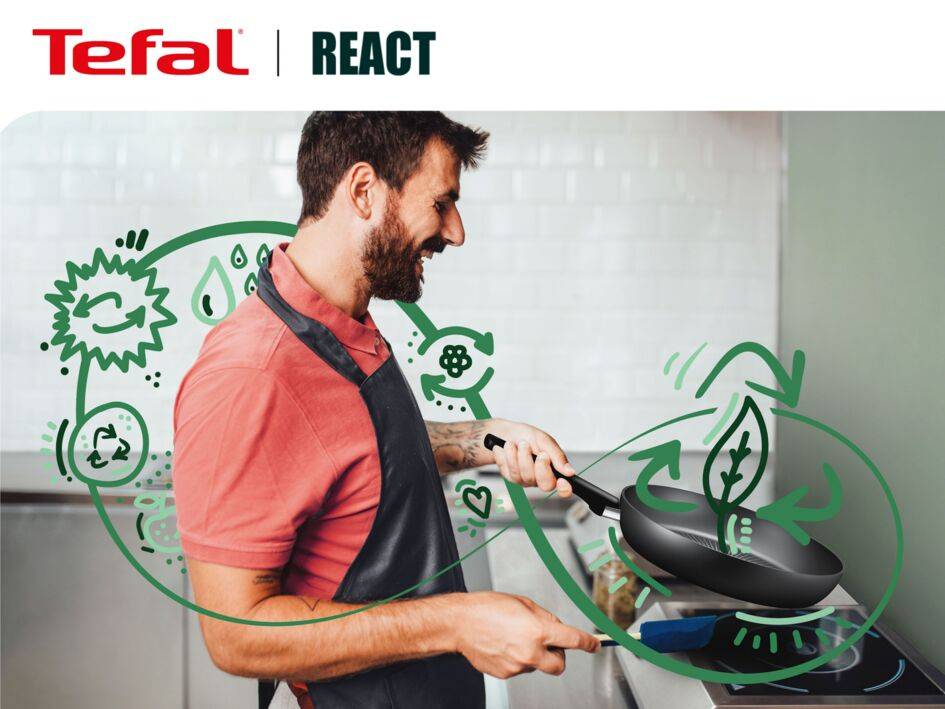 Ontdek Tefal React, een betaalbare en milieubewuste koekenpan die duurzame prestaties en altijd perfecte resultaten biedt. Onze veilige en duurzame uit Titanium versterkte antiaanbaklaag staat borg voor moeiteloos glijden en gaat twee keer zo lang mee.* De koekenpan is gemaakt van 100% gerecycleerd aluminium en heeft de kenmerkende functies van Tefal - inclusief de warmte-indicatorzone en geavanceerde inductietechnologie - voor makkelijker koken, dag na dag.