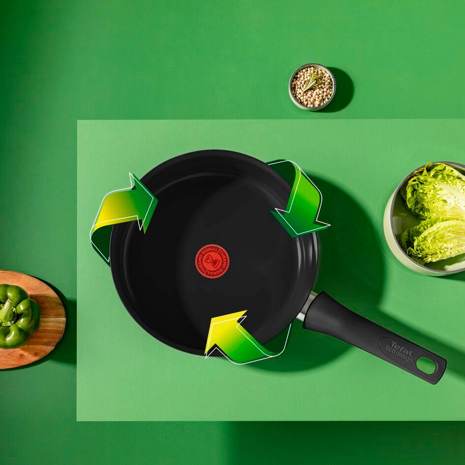 Deze vervaardigingsaanpak levert een 90% reductie in CO2-uitstoot op (Gerecycleerd aluminium in tegenstelling tot nieuw geëxtraheerd aluminium). De doelstelling van Tefal is om tegen 2025 13.500 ton gerecycled aluminium in onze in Rumilly, Frankrijk, gemaakte producten te verwerken.