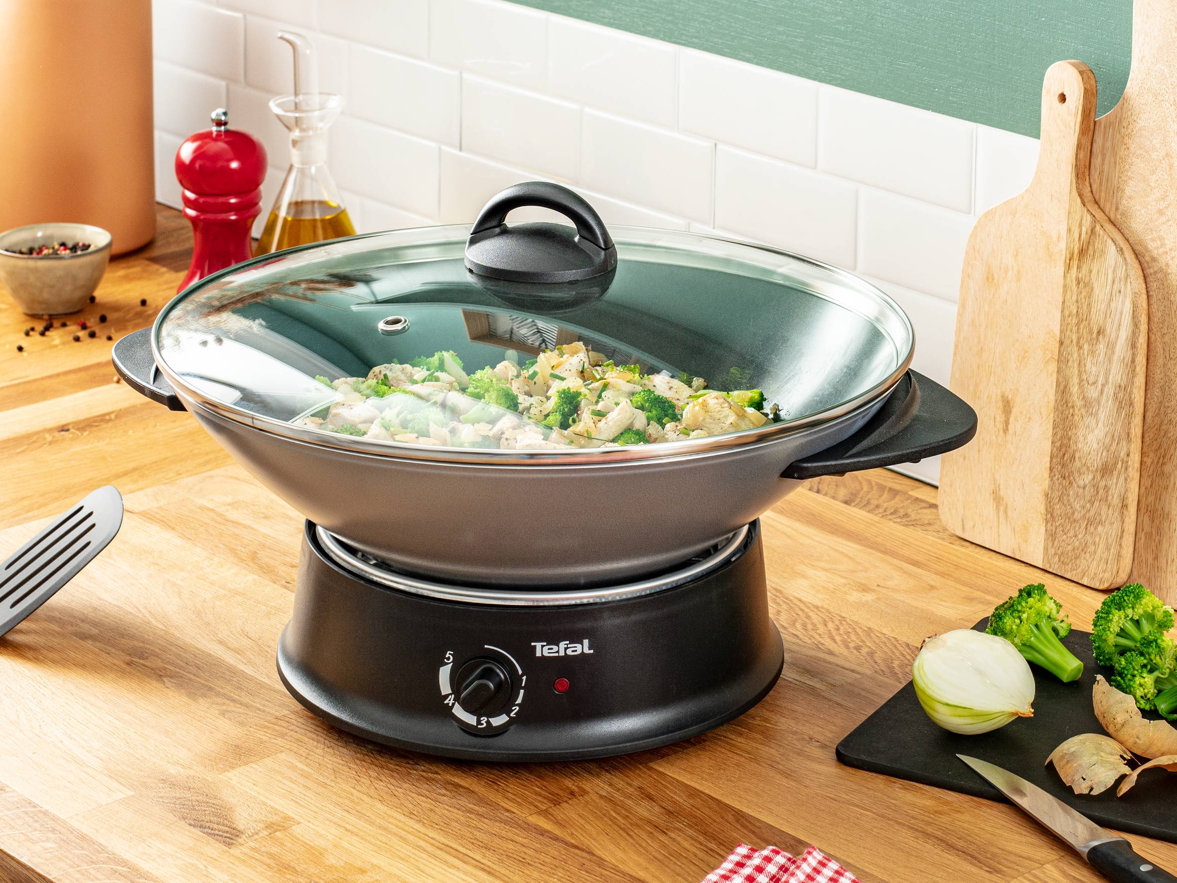POLYVALENT : Wok électrique avec thermostat réglable pour cuire tous les aliments ANTIADHÉSIF : Revêtement anti-adhésif Tefal pour une cuisson plus saine sans ajout de matière grasse CUISSON PARFAITE : Indicateur de chauffe Thermo-Spot® qui devient rouge lorsqu’il est temps de lancer la cuisson PRATIQUE : Couvercle en verre pour une surveillance facile lorsque vous cuisinez RÉSULTATS SAVOUREUX : Contact parfait entre le wok et la résistance pour des résultats savoureux EXPERTISE FRANÇAISE : Fabrication en Haute-Savoie, selon une expertise et un savoir-faire traditionnels